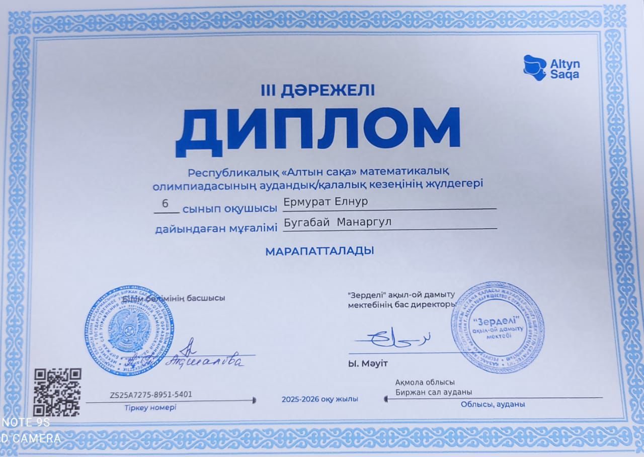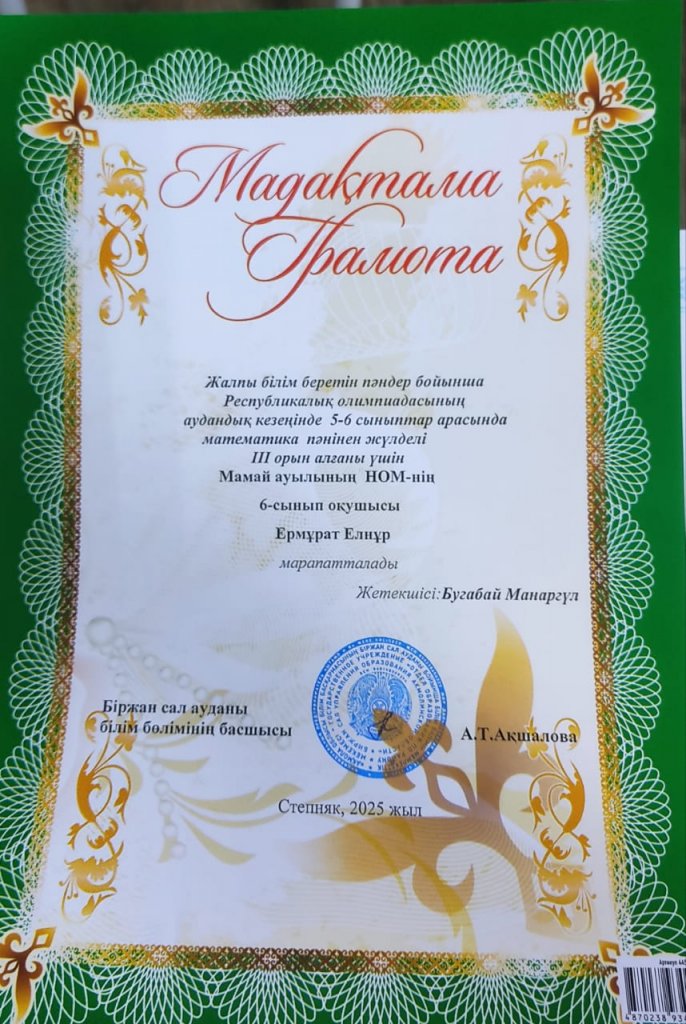 Ермурат Елнұр республикалық «Алтын сақа» математикалық олимпиадасының аудандық/ калалық, кезеніне қатысып, ІІІ орынға ие болды. Бұл жетістік - оның еңбегі мен ізденісінің, сондай-ақ ұстазы Бугабай Манаргулдің сапалы дайындығының, нәтижесі. Оқушымызды жоғары нәтижесімен құттықтап, алдағы жарыстарда да толағай табыстар тілейміз!